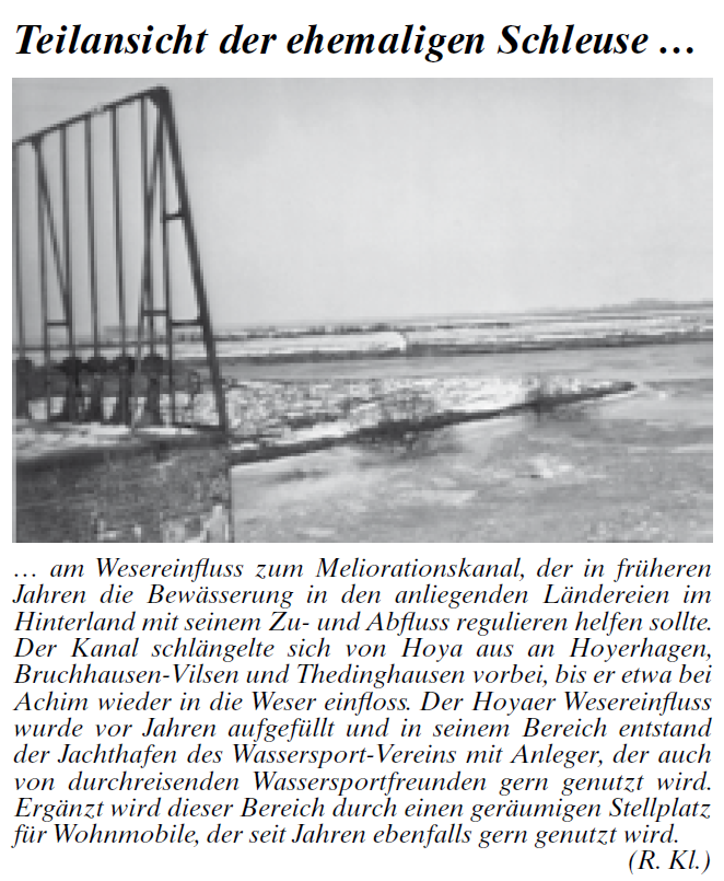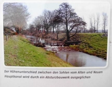 Ursprünglich war der Hauptkanal direkt über eine Einlassschleuse mit der Weser verbunden. Bei Weserhochwasser wurde die Schleuse geöffnet und Wasser kontrolliert über den Hauptkanal in die Meliorationsbereiche (Bewässerung) geleitet. Die Einlassschleuse wurde Mitte des letzten Jahrhunderts geschlossen und abgebaut.